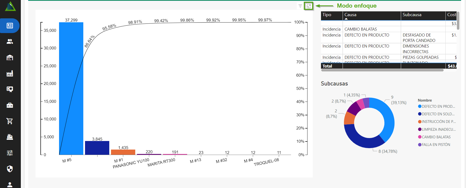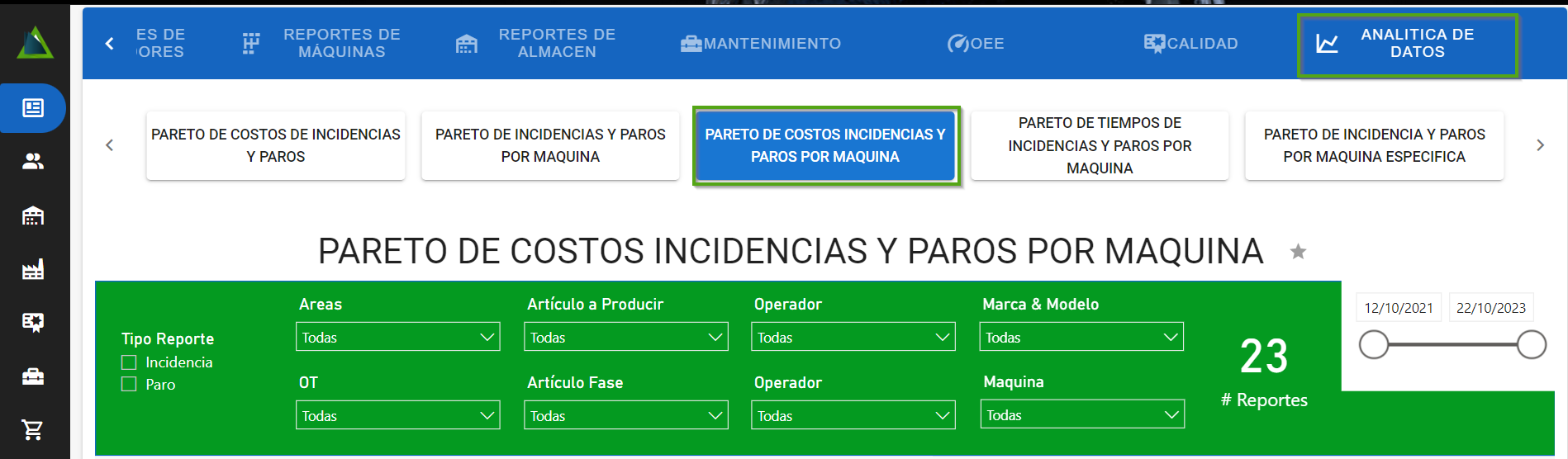 Ahora dirígete a “Pareto de costos incidencias y paros por máquina” en la sección de “Analítica de datos”.