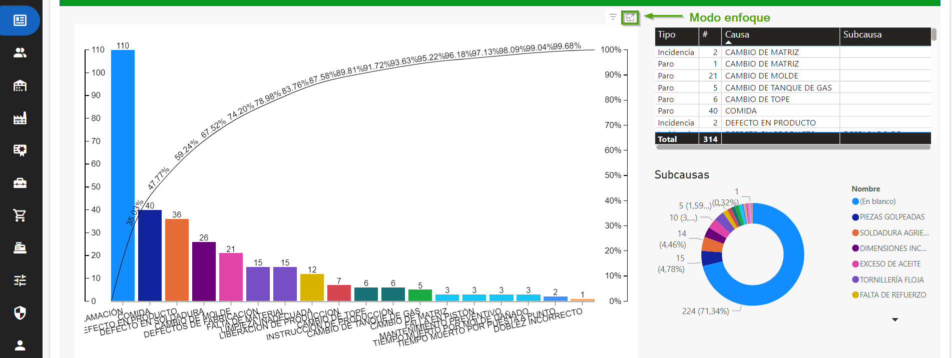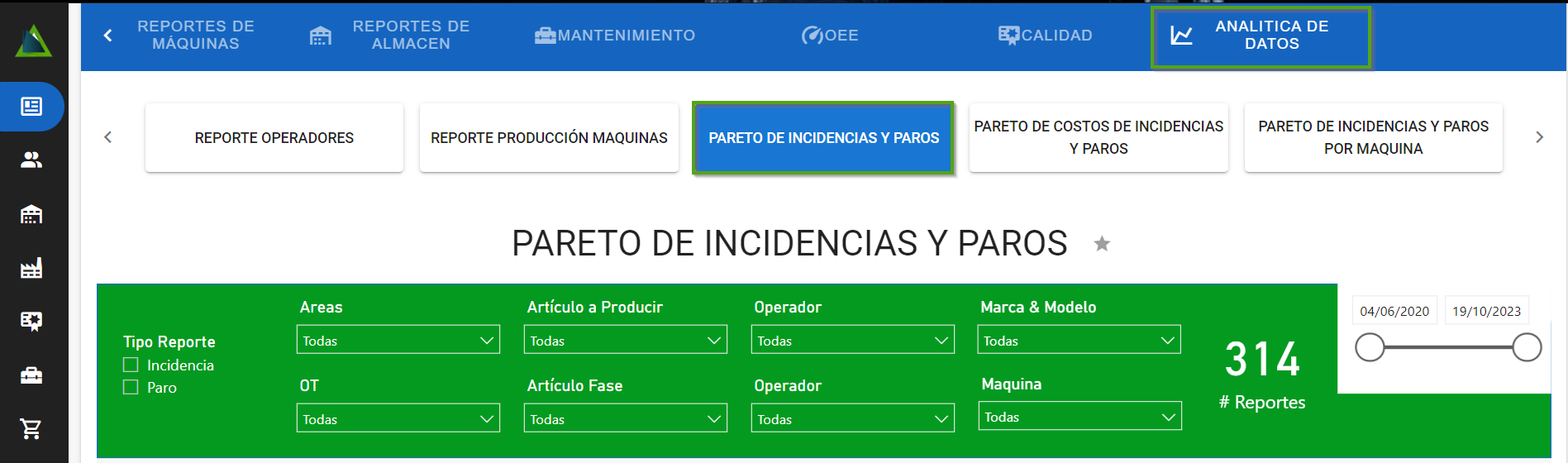 Ahora dirígete a “Pareto de incidencias y paros” en la sección de “Analítica de datos”.