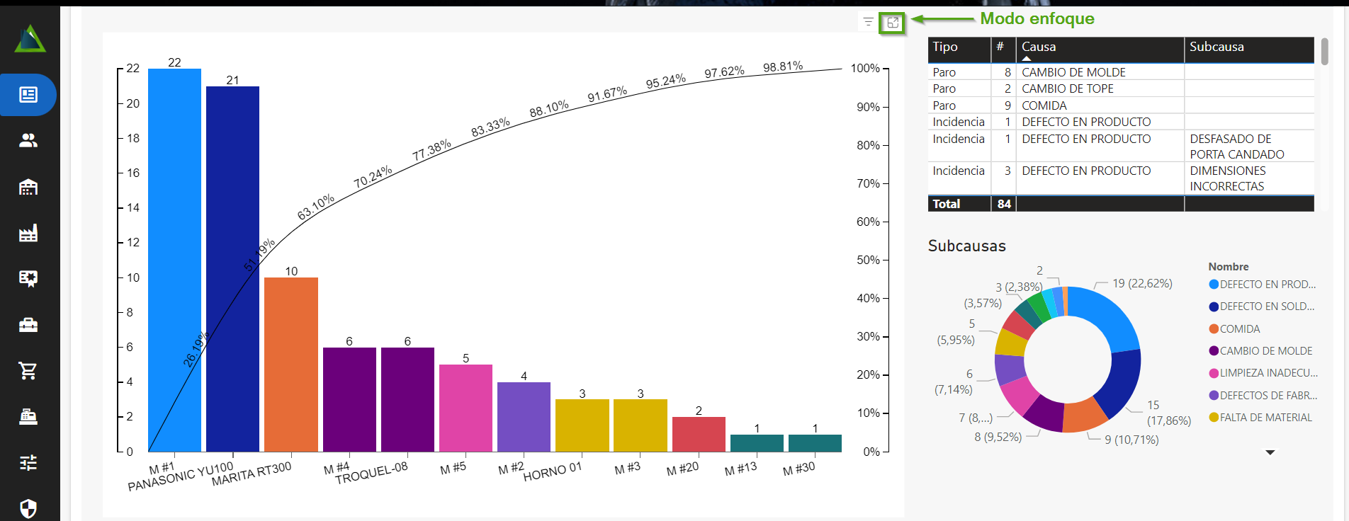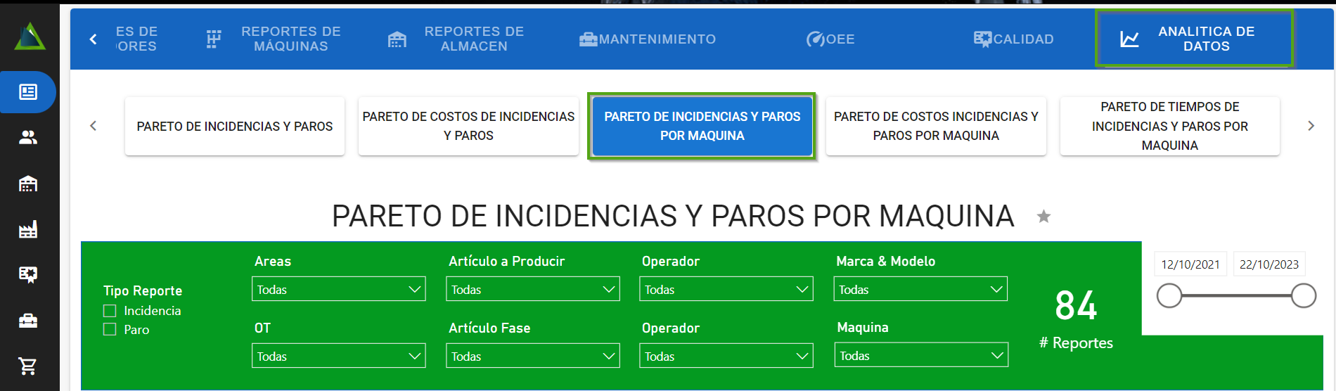 Ahora dirígete a “Pareto de incidencias y paros por máquina” en la sección de “Analítica de datos”.