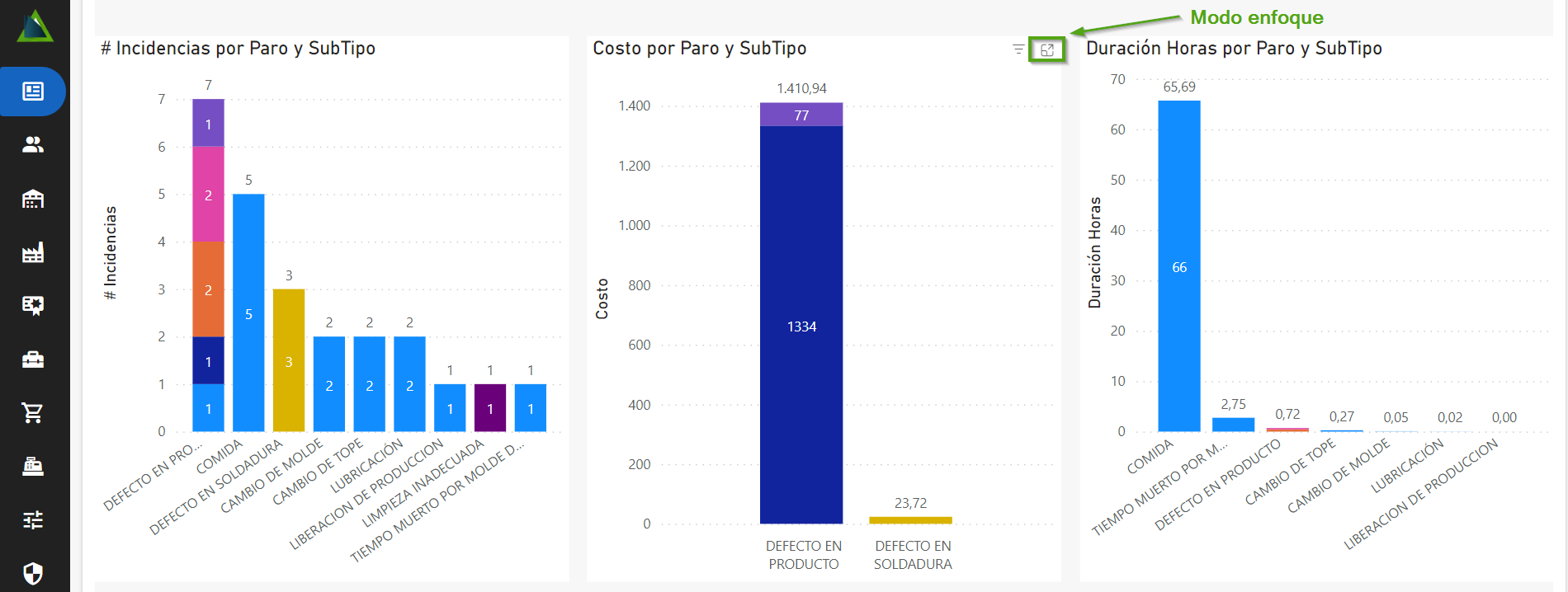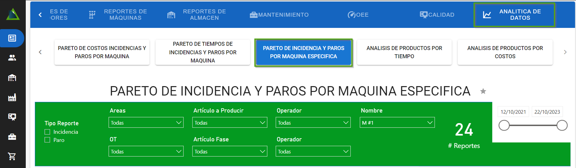 Ahora dirígete a “Pareto de incidencias y paros por máquina específica” en la sección de “Analítica de datos”.