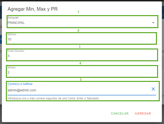 - Escribiremos el o los correos de las personas a las que deseamos notificar cuando el número de stock sea igual al número de reorden.