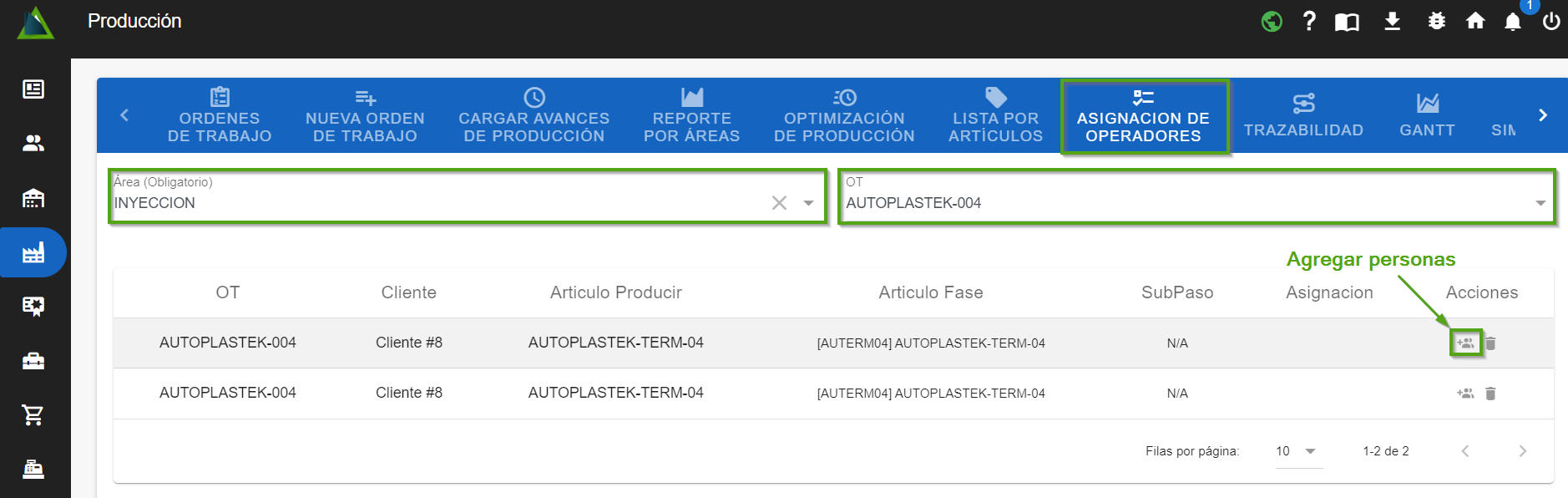 Debes seleccionar el área y opcionalmente puedes usar el filtro de “OT” para ser más preciso sobre a qué área deseas añadir un operador.