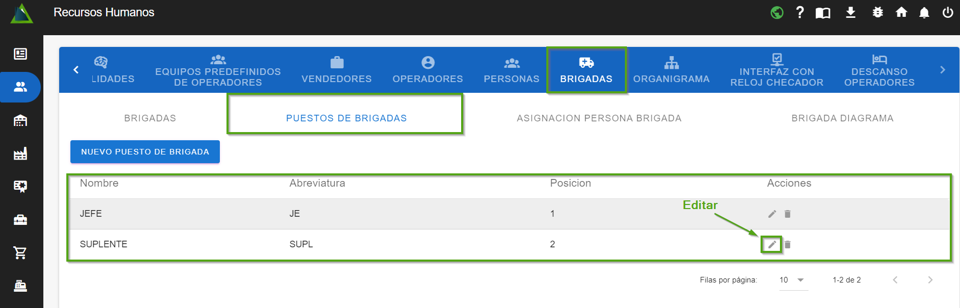- Una vez que hayas seleccionado el puesto de brigada que deseas editar, haz clic en el "ícono con forma de lápiz" para abrir el diálogo de edición.