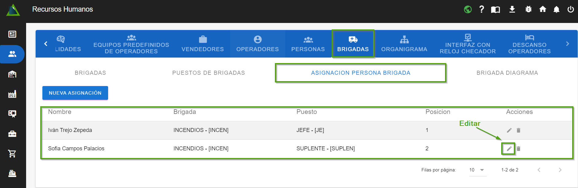 Al acceder aquí, podrás visualizar las asignaciones de personal a brigadas previamente creadas en el sistema.