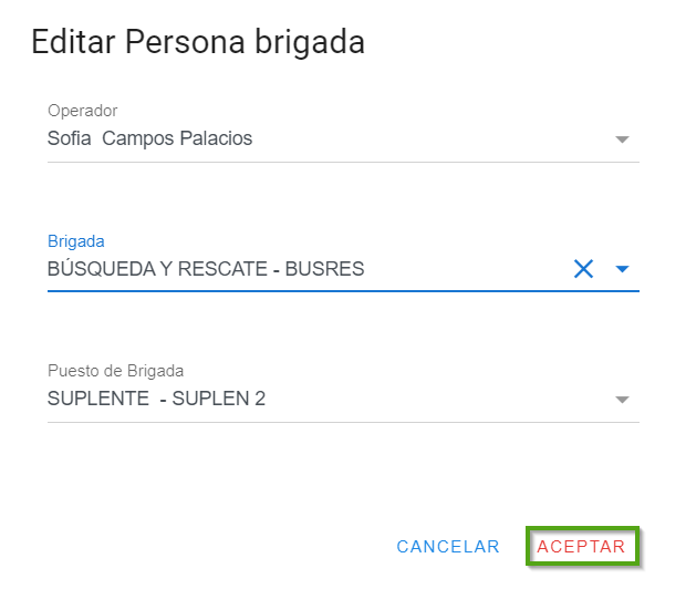 Al seleccionar la asignación de brigada, el diálogo de "editar" se abrirá automáticamente, mostrándote la información correspondiente. Para guardar los cambios realizados, haz clic en "aceptar" para hacerlos permanentes en el sistema.