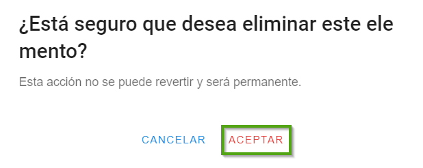 Nota. Para confirmar la acción de eliminar, haz clic en “aceptar”, esta es una acción permanente e irreversible.