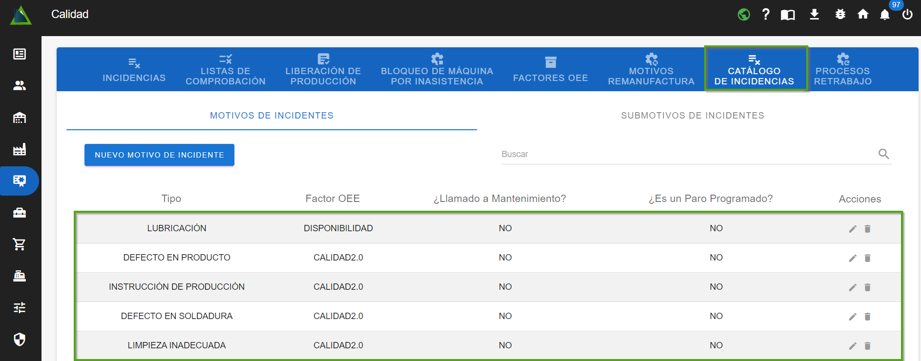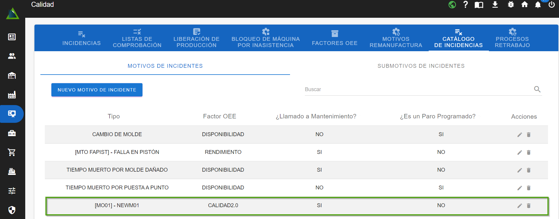1. Selecciona el factor OEE, por ejemplo, “Calidad2.0”.
