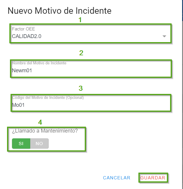 Haz clic en "Nuevo motivo de incidente" y se abrirá un diálogo emergente con la siguiente información.