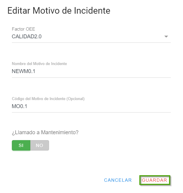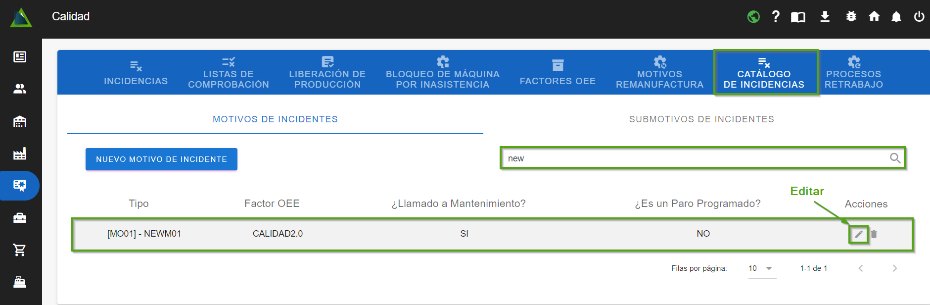 Una vez que hayas seleccionado el motivo de incidente que deseas editar, haz clic en el "ícono con forma de lápiz" para abrir el diálogo de edición.