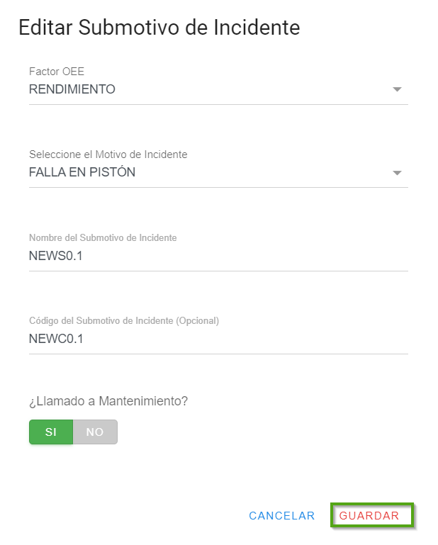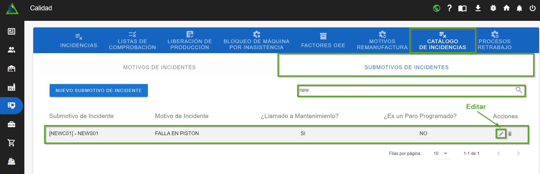 Una vez que hayas seleccionado el submotivo de incidente que deseas editar, haz clic en el "ícono con forma de lápiz" para abrir el diálogo de edición.