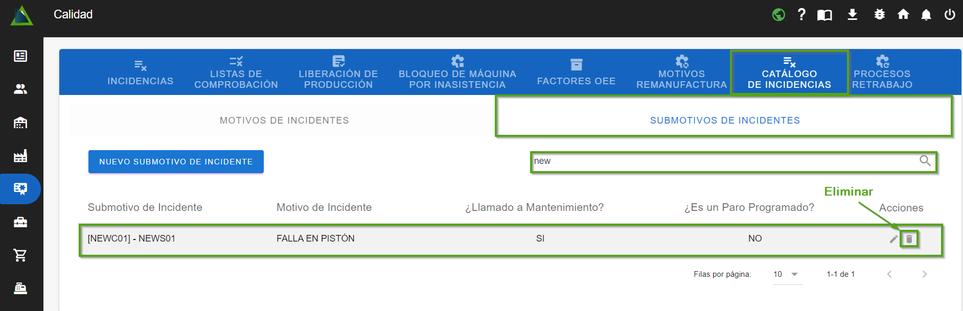 Al acceder aquí, podrás visualizar los submotivos previamente creados en el sistema. Puedes usar el buscador para localizar algún submotivo de incidente en específico a eliminar.