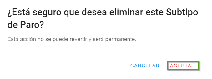 Nota. Para confirmar la acción de eliminar, haz clic en “aceptar”, esta es una acción permanente e irreversible.