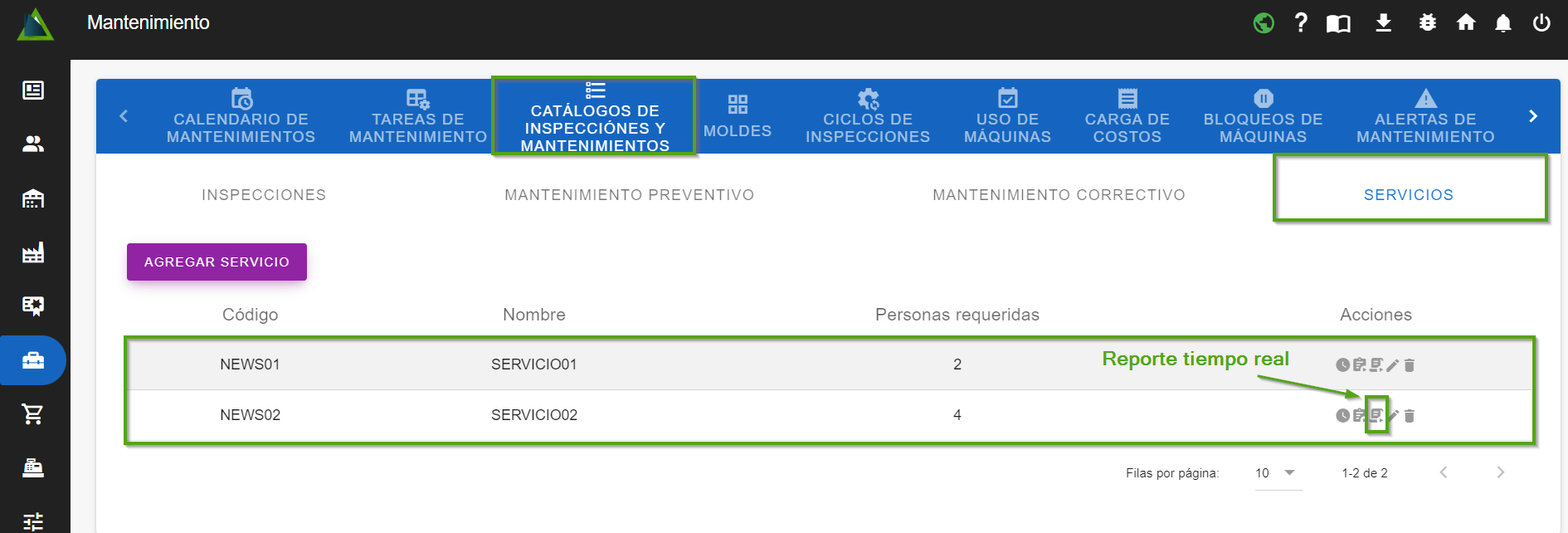 Una vez que hayas seleccionado el servicio del cual deseas su reporte, haz clic en el "ícono de reporte tiempo real" para abrir el diálogo.