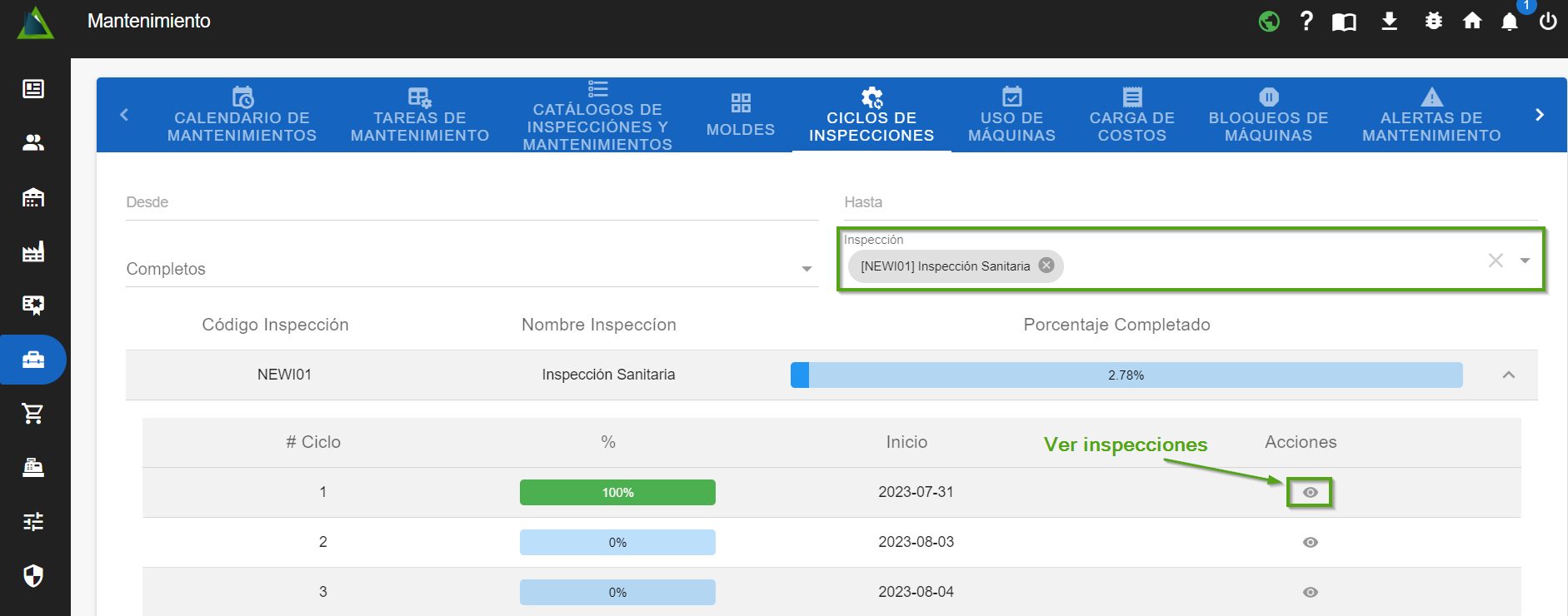 - Una vez que hayas seleccionado el ciclo del cual deseas ver sus inspecciones, haz clic en "ícono con forma de ojo". A continuación, se abrirá el diálogo.