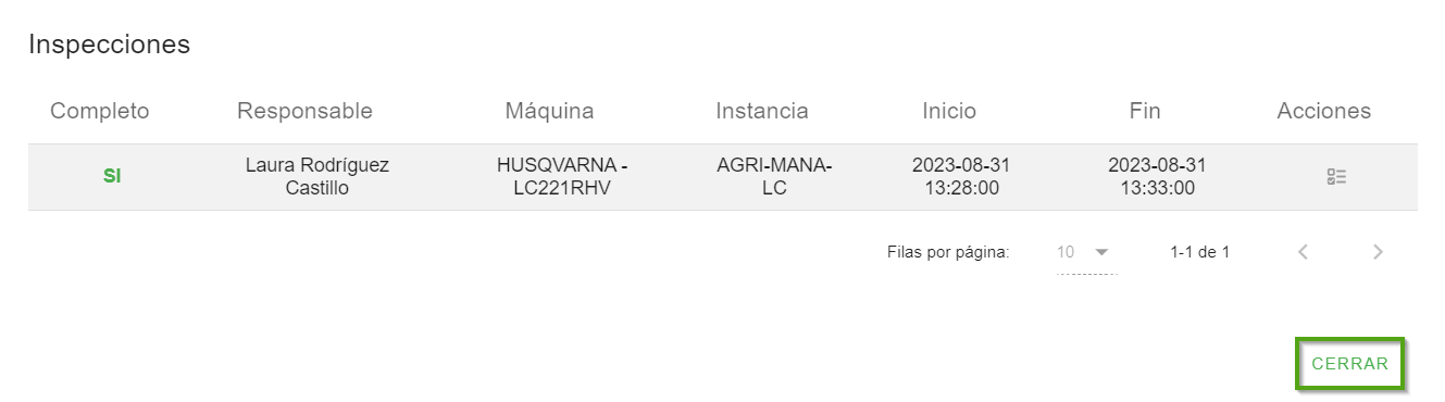 Nota. Una vez hayas observado su(s) inspección(es) haz clic en “cerrar”, el diálogo se cerrará de forma automática.
