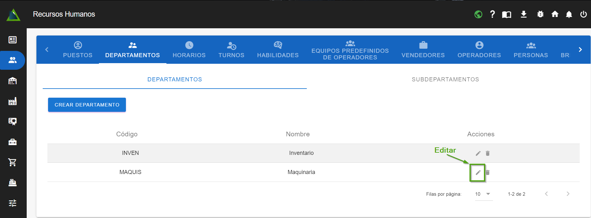 - Una vez que hayas seleccionado el departamento que deseas editar, haz clic en el "ícono con forma de lápiz" para abrir el diálogo de edición.