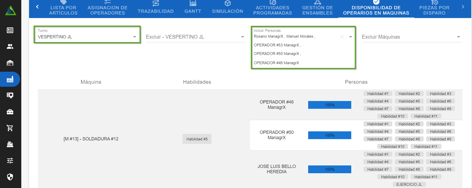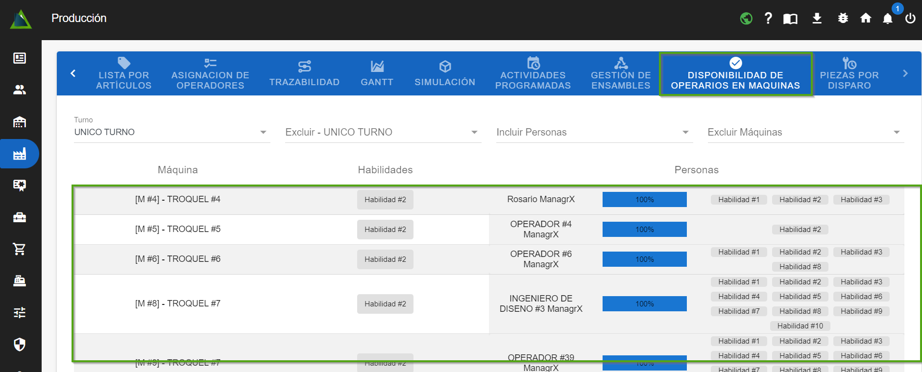 Al acceder aquí podrás visualizar las máquinas junto con sus operarios disponibles y sus habilidades existentes en el sistema.