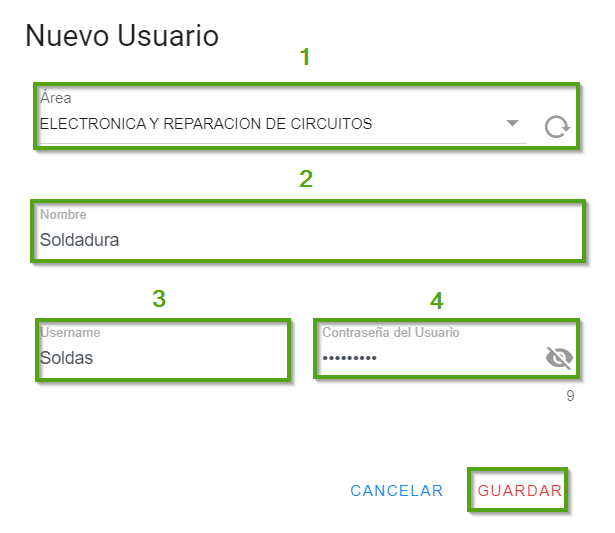 - Haz clic en "Nuevo usuario" y se abrirá un diálogo emergente con la siguiente información.