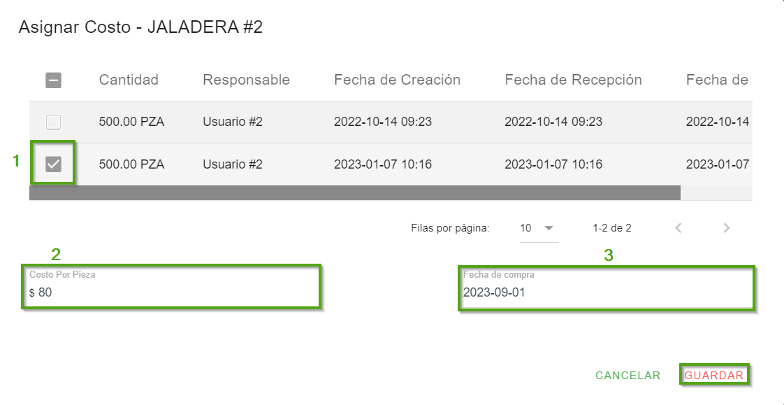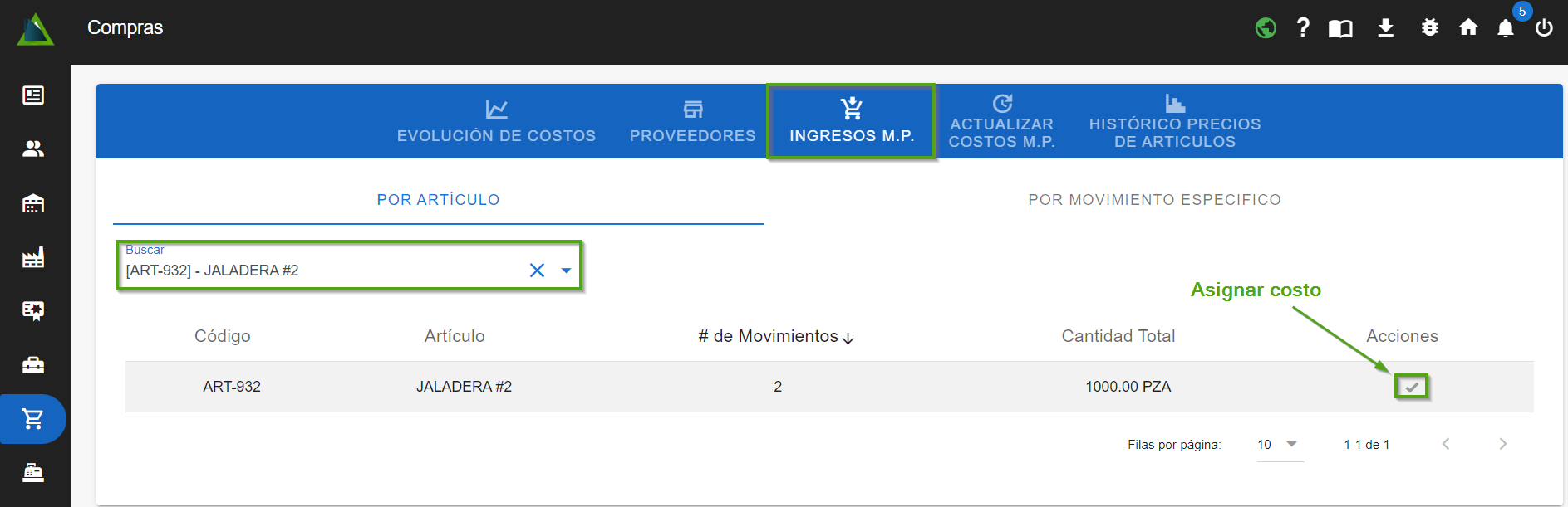 Una vez seleccionado el artículo al cual deseas asignarle su costo, haz clic en el “ícono con forma de flecha indicando aprobación” para abrir el diálogo.
