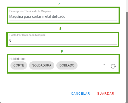 (Nota. En el caso de no saber el costo podrás agregarlo en 0 pero para tener un costo exacto en los reportes deberás poner el costo real) - Podrás seleccionar una o muchas habilidades que se necesitan para usar la máquina o herramienta, estas habilidades serán necesarias por cada operador que desee manejar la máquina o herramienta por seguridad (dentro del sistema se encuentra un catálogo de habilidades en caso de no encontrar alguna habilidad podrás generar una nueva)