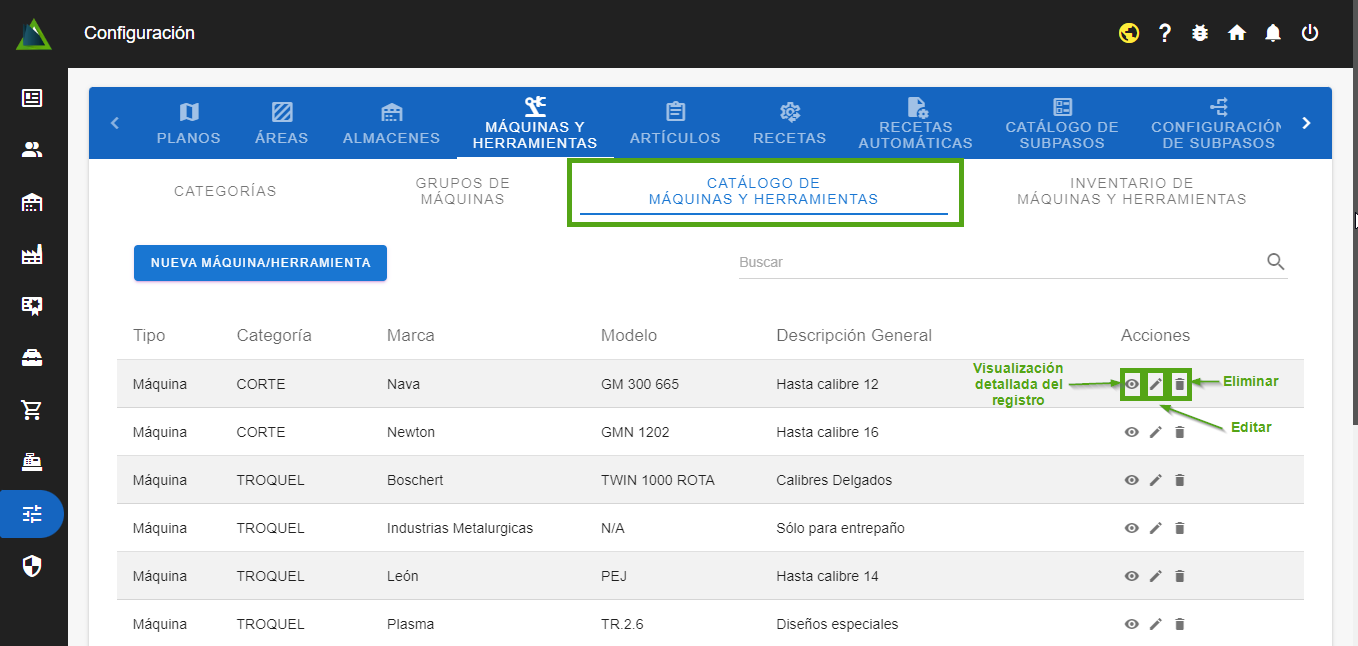 - Dirigirse a la subsección "Catálogo de máquinas y herramientas", dentro del "Catálogo de máquinas y herramientas" podrás ver todas las máquinas y herramientas que están dadas de alta dentro del sistema, así mismo podrás editar y eliminar cada registro que desees.