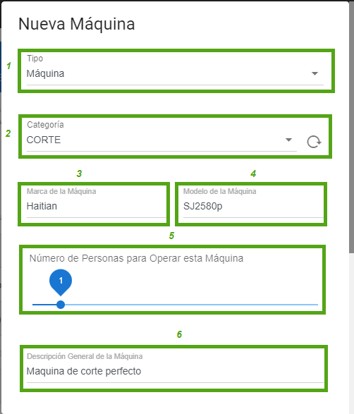 - Para generar una nueva "máquina o herramienta" tan simple con un click en "Nueva máquina/Herramienta", te pedirá los siguientes campos para hacer un registro exitosamente.