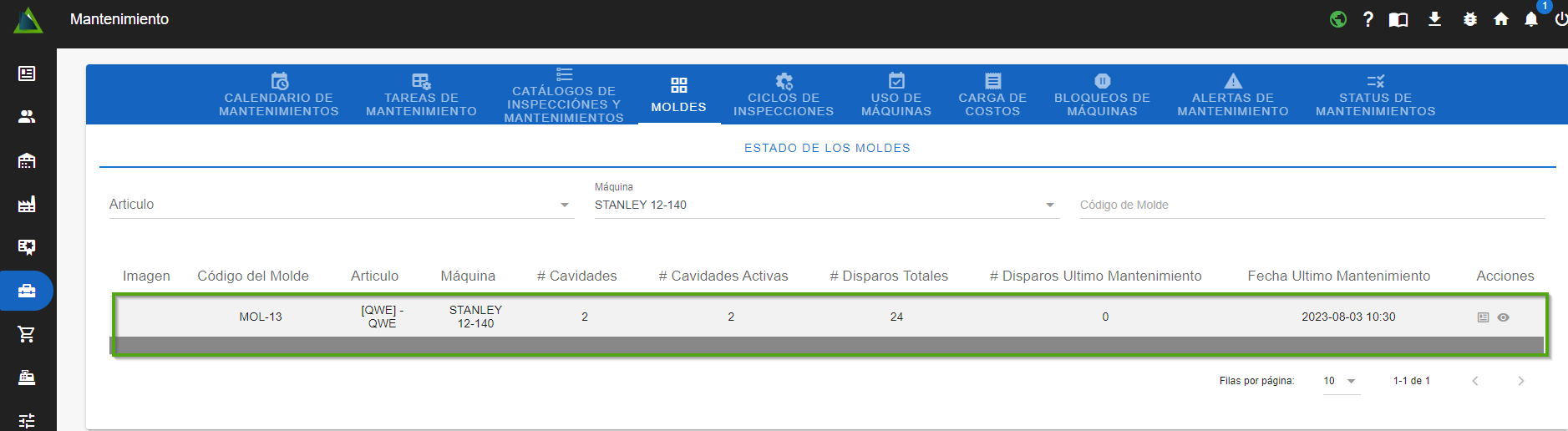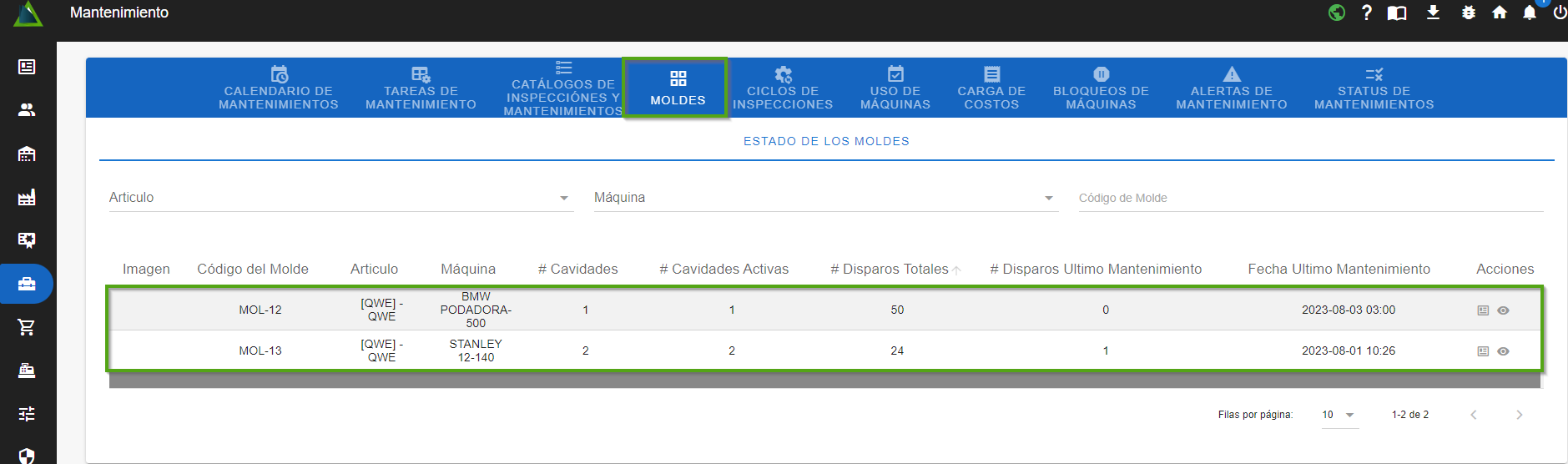 Puedes usar los filtros para localizar algún molde en específico a reportar su mantenimiento.