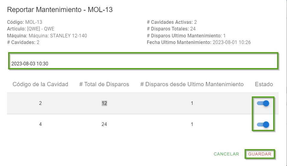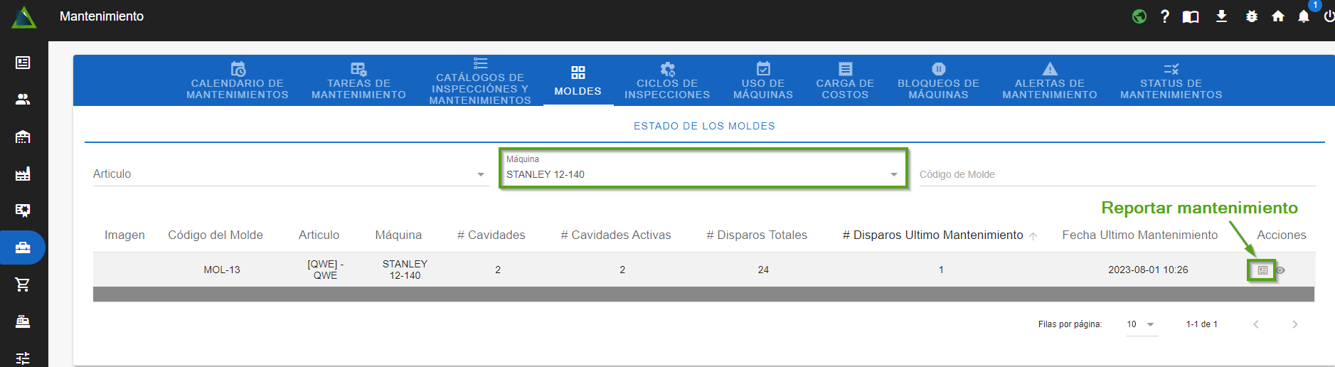 - Una vez que hayas seleccionado el molde del cual deseas su reporte, haz clic en "ícono de reportar". A continuación, se abrirá el diálogo para el mantenimiento.