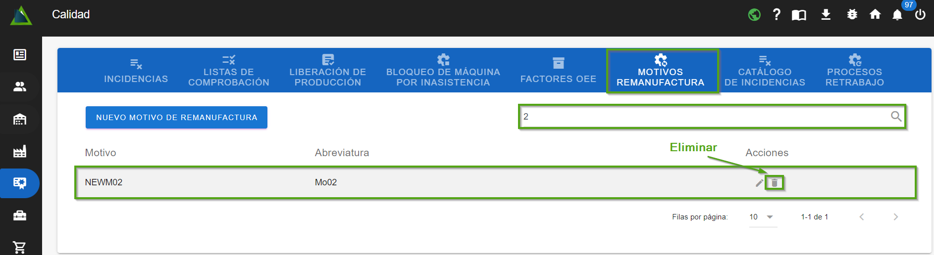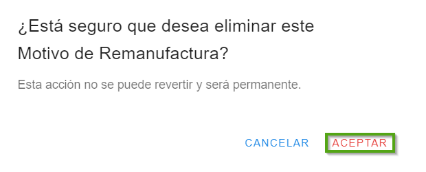 Una vez que hayas seleccionado el motivo remanufactura que deseas eliminar, haz clic en "ícono con forma de bote de basura". A continuación, se abrirá el diálogo para confirmar la eliminación del motivo seleccionado.