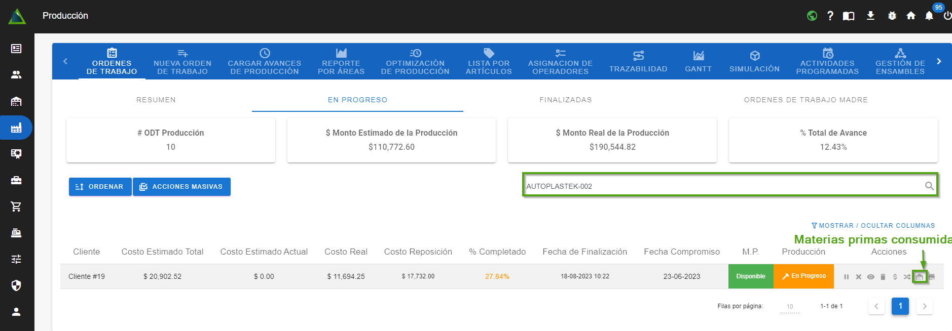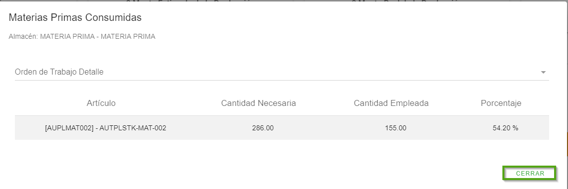 Una vez que hayas seleccionado la orden de la cual quieras ver el consumo de sus materias primas, haz clic en el "ícono de materias primas consumidas" para abrir el diálogo.