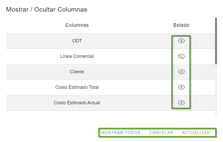 Nota. Para ocultar o mostrar haz clic en el “ícono con forma de ojo”, después haz clic en “actualizar” para guardar los cambios, en caso contrario, haz clic en “cancelar”. Puedes usar un atajo haciendo clic en “mostrar todos” y después en “actualizar” en caso de querer mostrar toda la información. En cualquiera de los 3 casos el diálogo se cerrará de forma automática.
