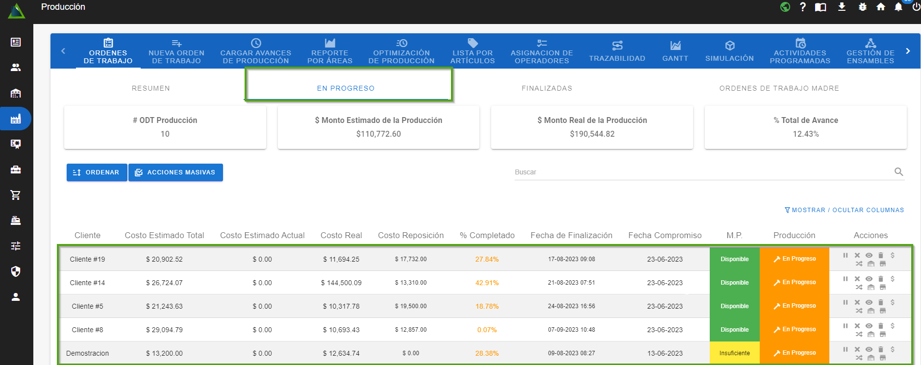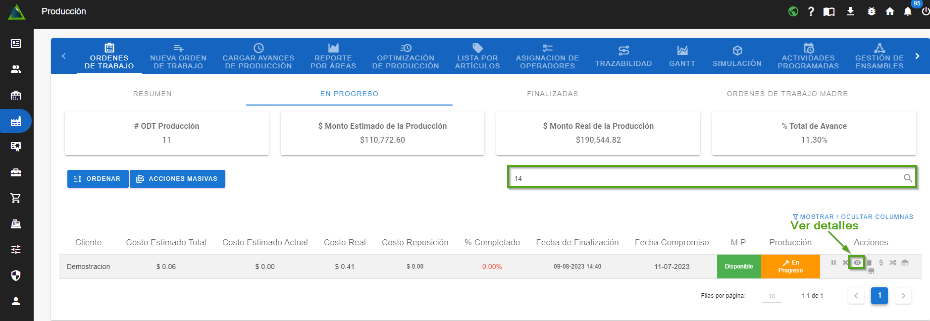 En esta sección encontrarás varias acciones que puedes realizar con las órdenes en progreso. A continuación, te explicaré como ver los detalles de una orden en progreso.