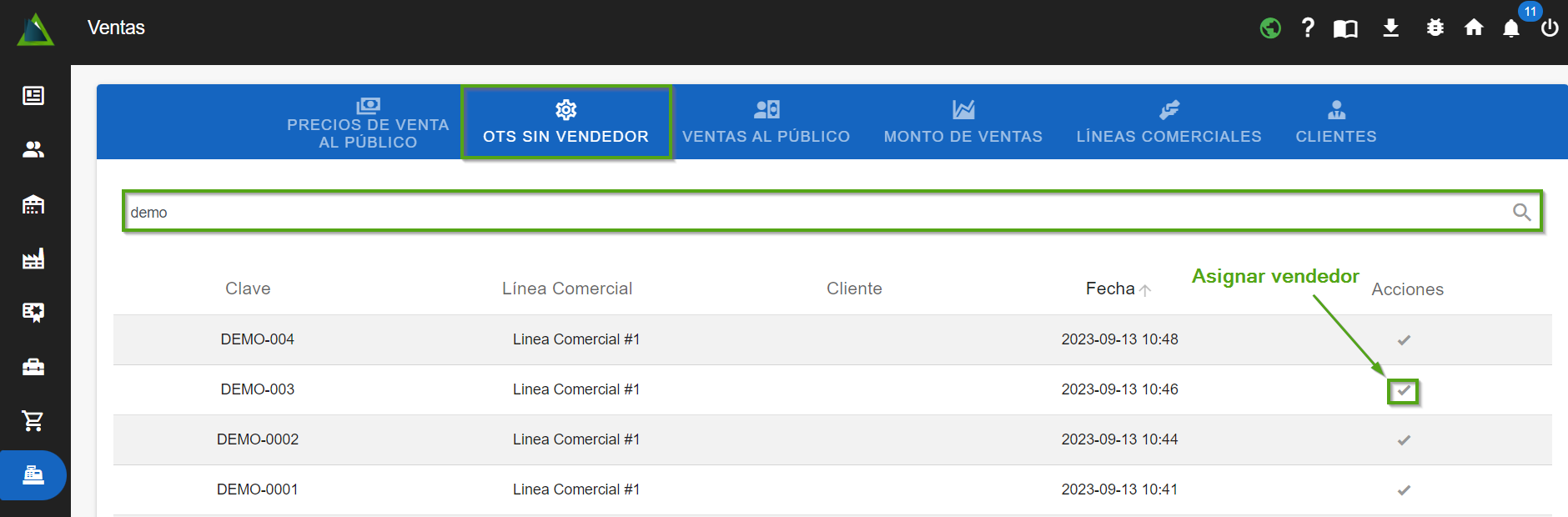 Nota. Selecciona el vendedor y haz clic en “aceptar”, el diálogo se cerrará de forma automática y la ots desaparecerá de esta sección.