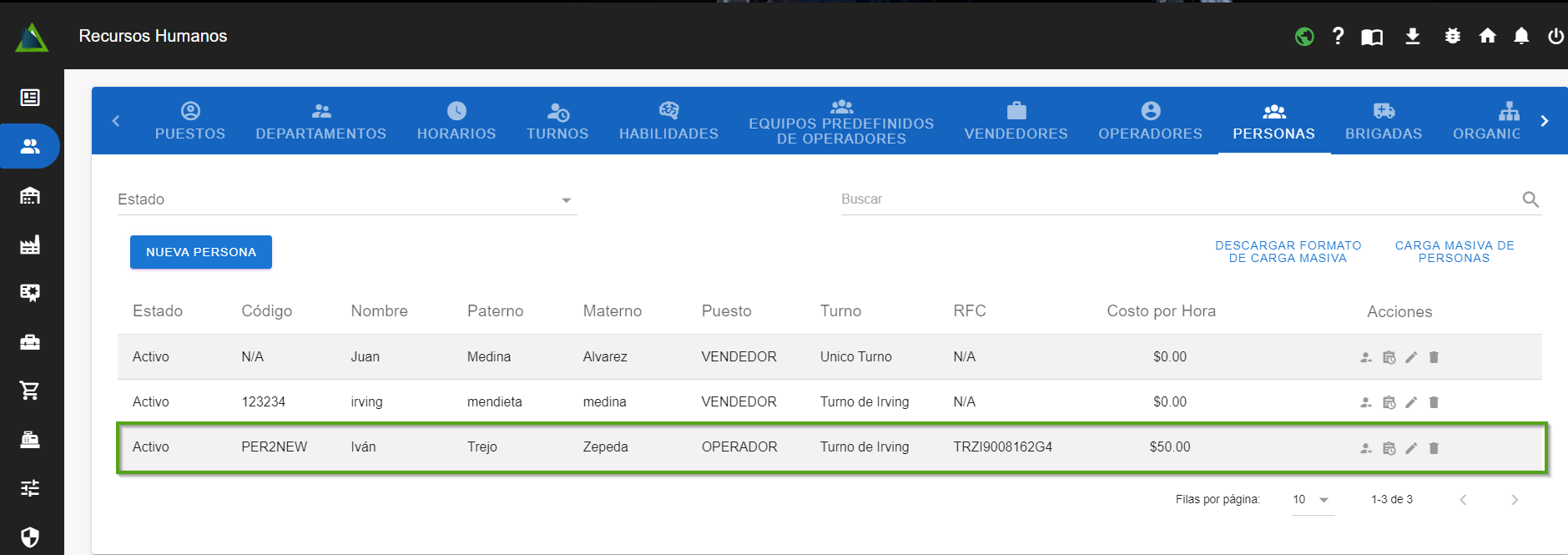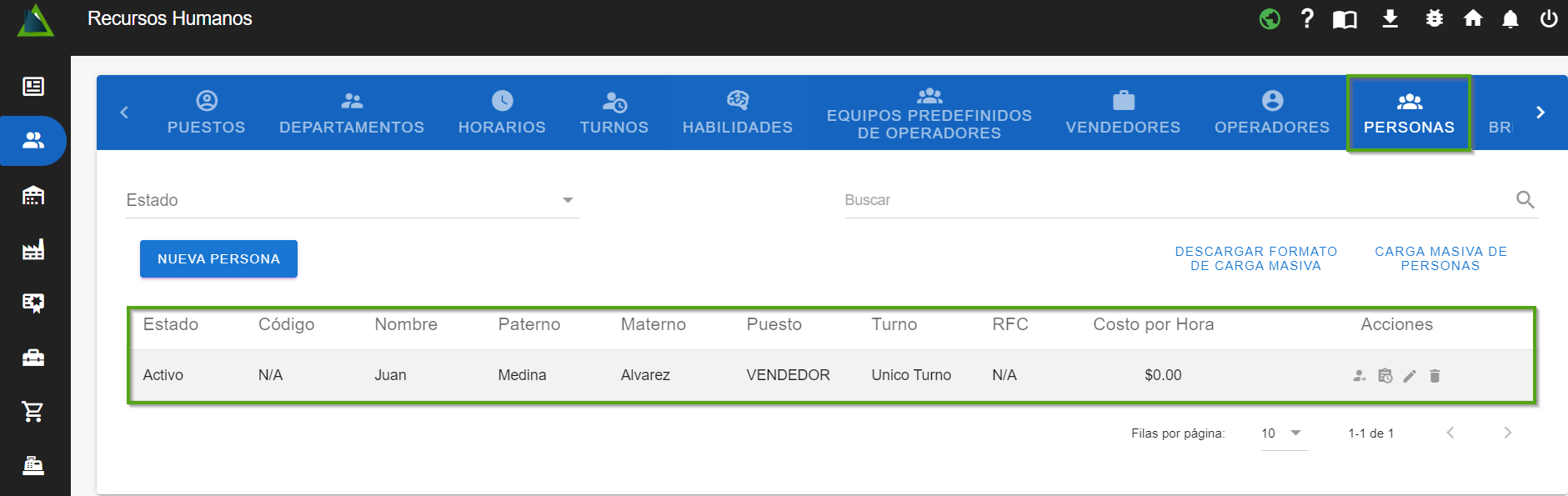 Al ingresar a esta sección, podrás visualizar las personas existentes en el sistema. En esta pestaña, encontrarás las opciones para Crear, Modificar y Eliminar una persona. A continuación, te explicaré el proceso para agregar una nueva persona.