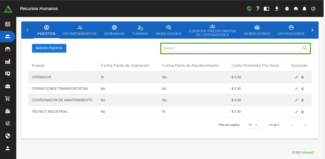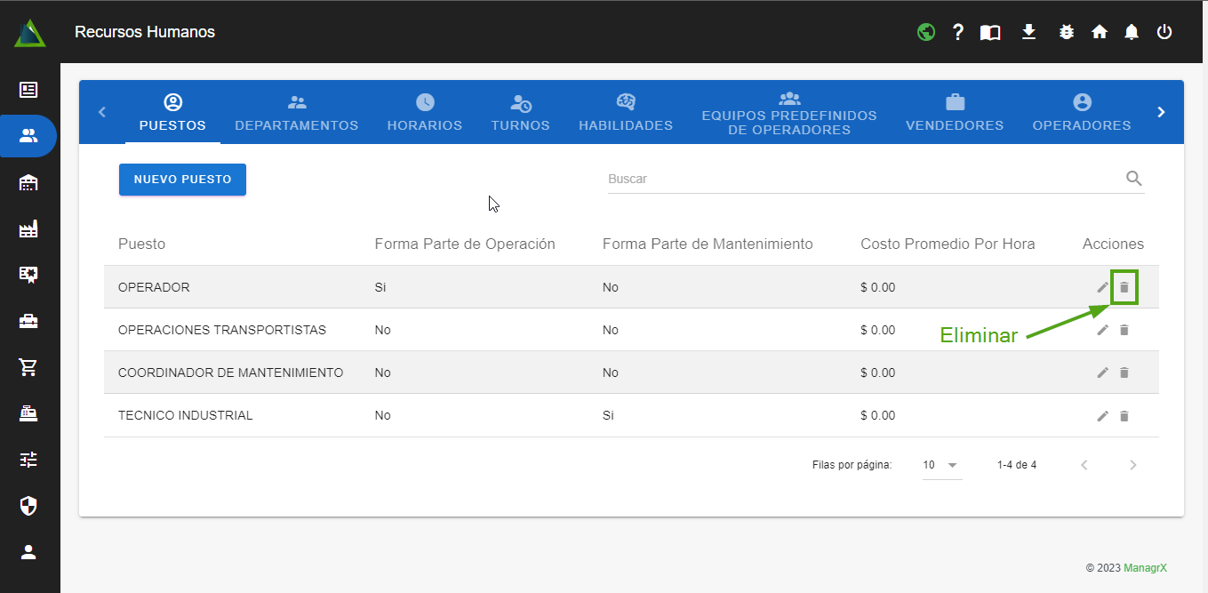 Para poder Eliminar un Puesto en ManagrX debe seguir los siguientes pasos.