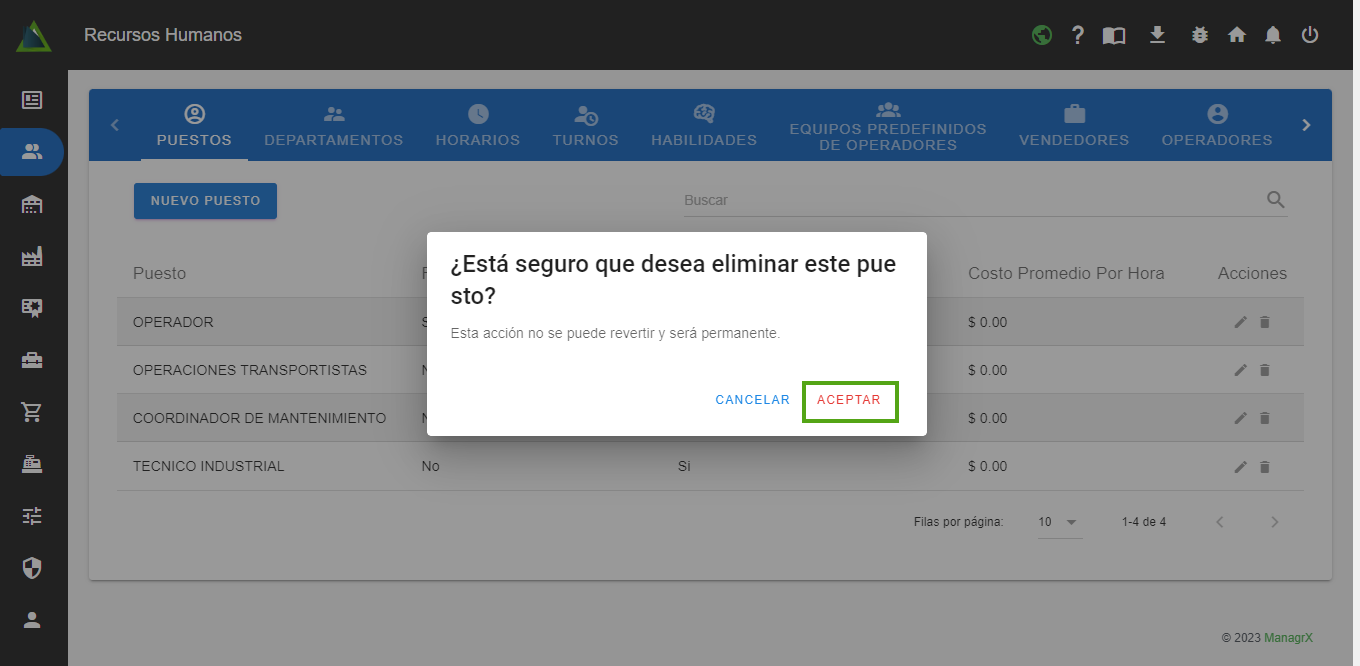 - Se abrirá una ventana donde le preguntará si está seguro de que desea borrar el puesto previamente seleccionado.