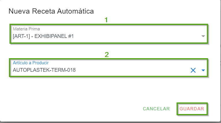 - Haz clic en "Nueva receta automática" y se abrirá un diálogo emergente con la siguiente información.