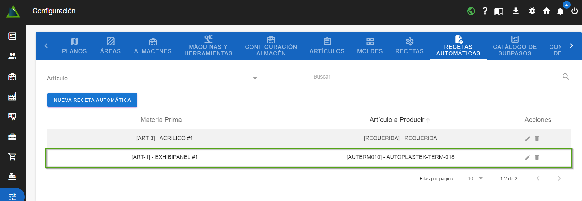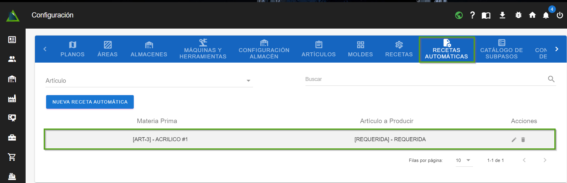 Al ingresar a esta sección, podrás visualizar las recetas automáticas existentes en el sistema. En esta pestaña, encontrarás las opciones para Crear, Modificar y Eliminar recetas automáticas. A continuación, te explicaré el proceso para agregar una nueva receta automática.