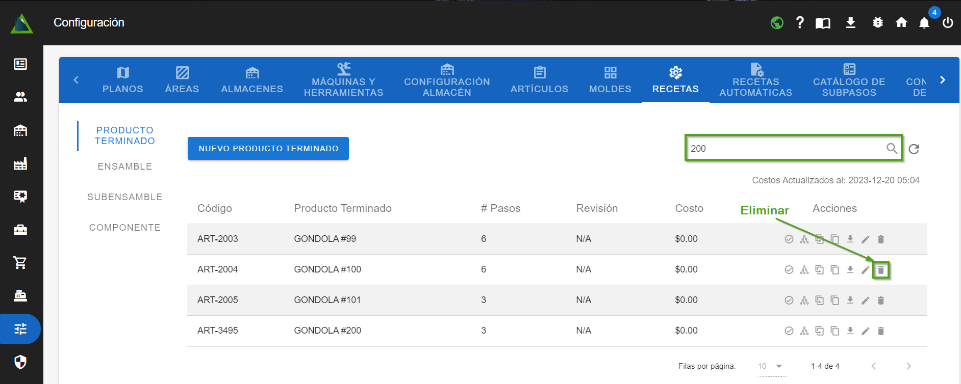 Puedes usar el “buscador” para localizar algún producto terminado en específico del cual deseas eliminar su receta.