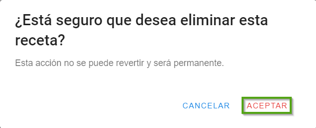 Una vez que hayas seleccionado la receta del producto terminado que deseas eliminar, haz clic en el "ícono con forma de bote de basura". A continuación, se abrirá el diálogo para confirmar la eliminación de la receta seleccionada.