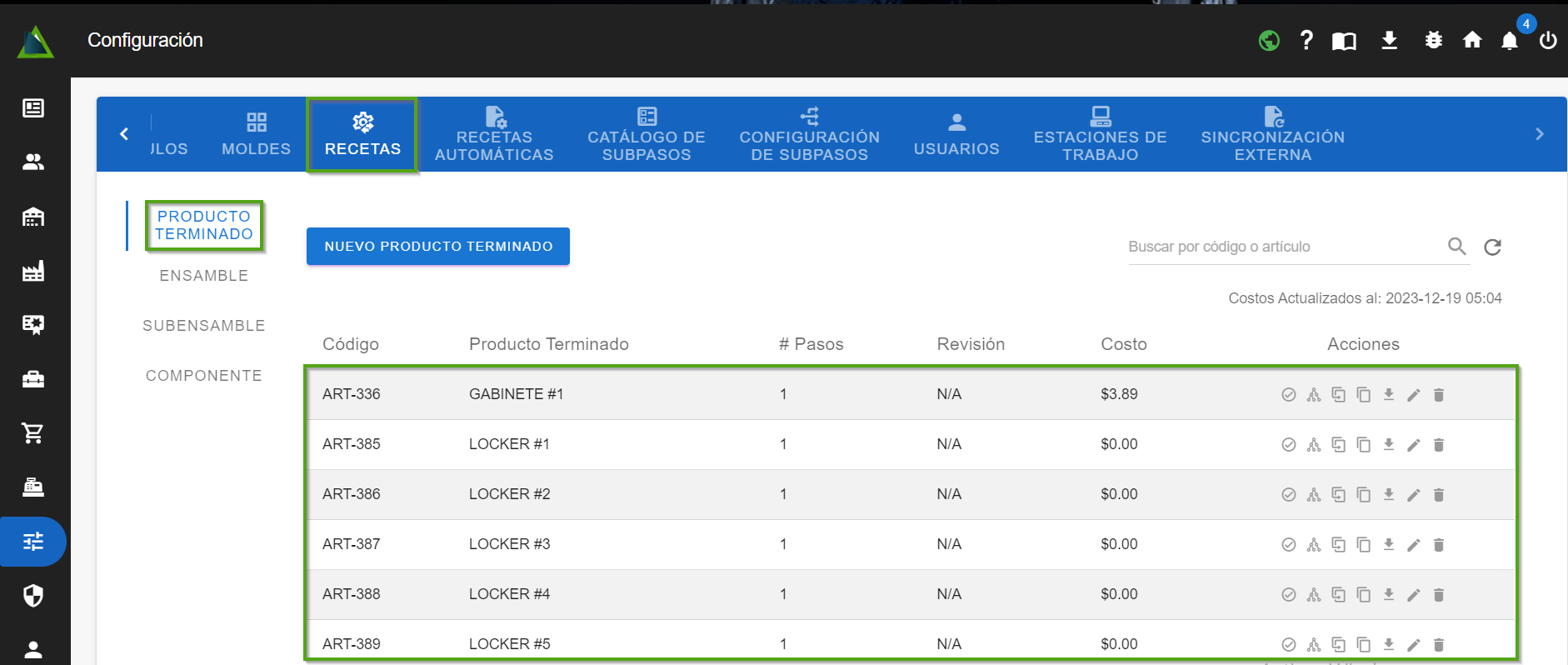 Al acceder aquí, podrás visualizar las recetas de productos terminados existentes en el sistema.