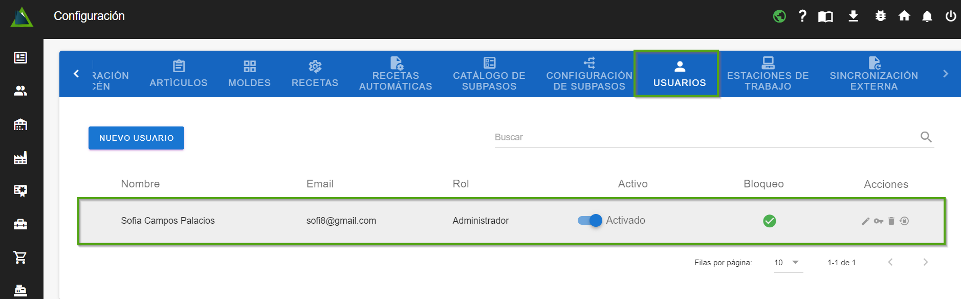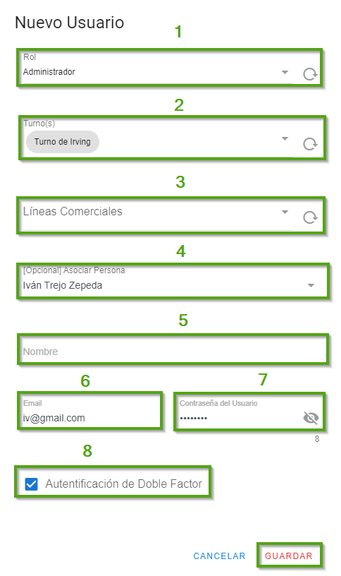 - Haz clic en "Nuevo usuario" y se abrirá un diálogo emergente con la siguiente información.